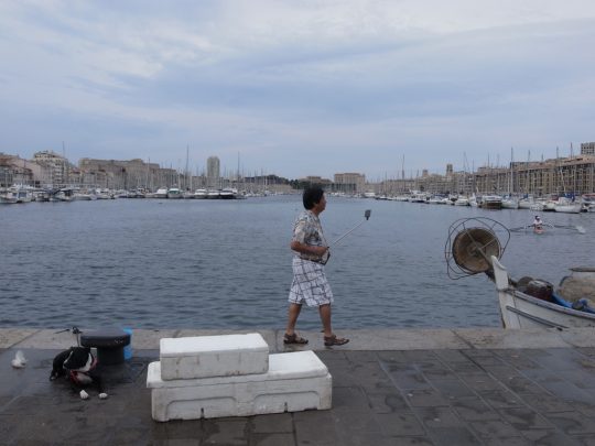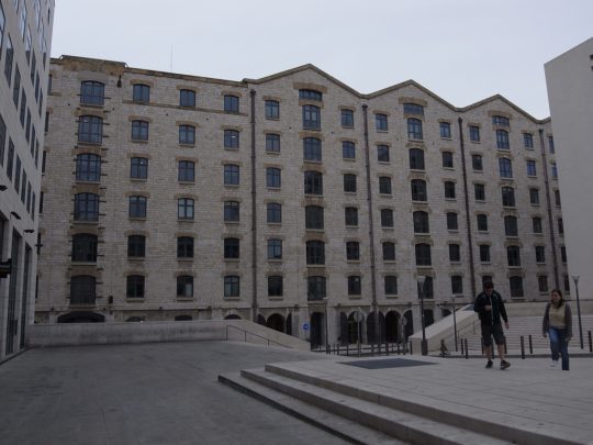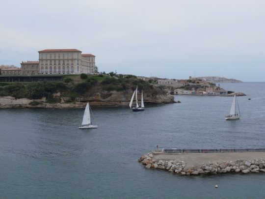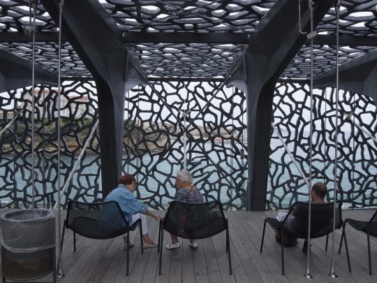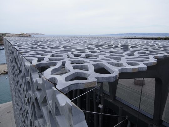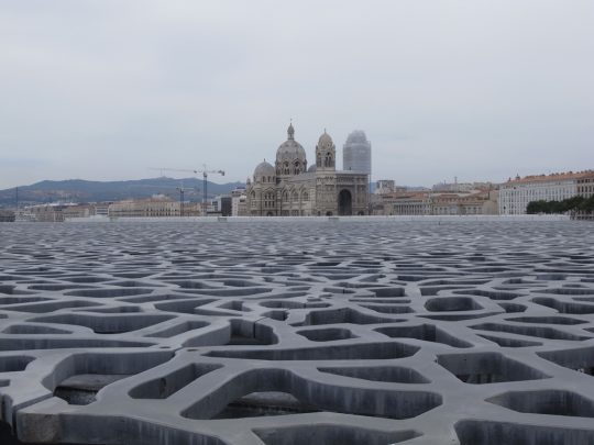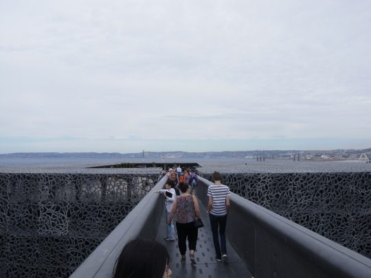 マルセイユ。今日もとりあえず旧港まで行き、魚の直売マルシェを見つつ、地中海・ヨーロッパ文明博物館(Musée des Civilisations de l’Europe et de la Méditerranée / MuCEM)へ。昔の要塞から入り、そこから橋を渡って水面模様(もずく模様?)のファサードの現代建築へと入る。この模様はなんとコンクリート製。遠くから見るとまるで金属である。建物の中に入ると水面下から地中海を見ているような感じになる仕組みである。まあ、ハリボテといえばハリボテなのだが。