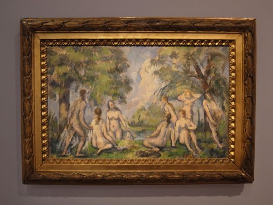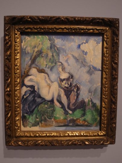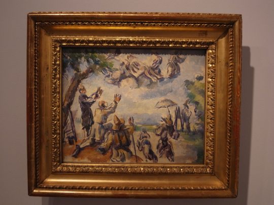 小一時間経ったので、アトリエへ戻る。今度はアメリカン・テロリスト達はいなくなっていて、我々もゆっくり見ることができた。ここは1902年の最晩年に新築されたアトリエであるが、別段すばらしい建築ではないものの、絵を描いたり運んだりするために機能的にできていて、ここを買い取ったセザンヌ研究者のおかげで当時使われていた道具も残されている。天井まで届くような脚立。彼が着ていたマントやパラソル。静物画に使われた机や椅子、皿、壺。外からキャンバスを出し入れできるように空けられた縦長の窓。庭では『大水浴図 Les Baigneuses』を描いたという。