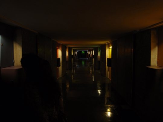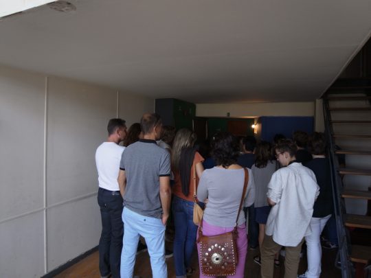 ひょっとして預かってくれるかもしれない、と思ってメトロに乗り数日前泊まったホテルに寄ってみるが、なんとフロントが閉まっている。そういえば週末の昼はフロントが閉まるのだった。アパートホテルの難点。でもひょっとしたら近くの別のホテルが有料で預かってくれるかもしれない!と思って当たってみるが、「非常に申し訳ないけど宿泊客じゃない方の荷物は預かれません」と丁重に断られる。まあ至極当然である。タクシーに預けて待たせておくか?いやそんな金は無い。しかしひょっとしたらガイドツアー用の倉庫ぐらいあるかもしれない。一縷の望みを託し、ユニテまでバスで向かう。玄関ホールで点呼を取っているガイドのおばさんに、「あなたたち、スーツケース持ってるの?そうね、じゃあちょっとこっちに来て。」と言われてガーディアンのところまで連れて行ってもらい、交渉してなんと預かってもらうことができた。「テロ以降警戒レベルが上がってて普通は預かってくれないんだけど、彼は特別に預かってくれるみたい」と好意で預かってもらえた。これで無事に訪問できると胸をなでおろす気持ちだった。