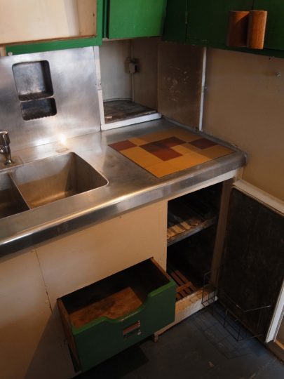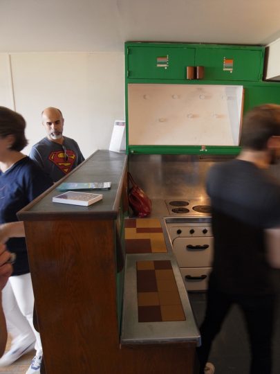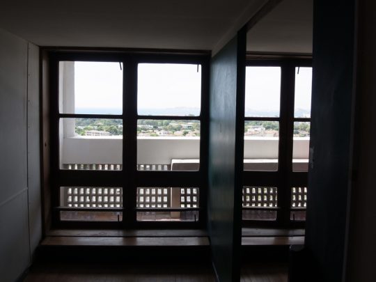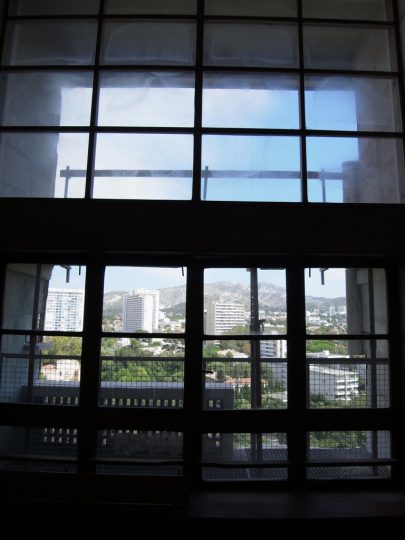 ようやく訪問できたユニテ・ダビタシオンは、原寸大模型を森美のコルビュジエ展とパリの建築・文化財博物館で見ていて大体の寸法感覚は知っていたが、割と広いと思っていた。しかし実際の部屋に入ってみると、メゾネットにより2分割された天井は思ったより低く感じる。船室をモチーフにしているためかなりファンクショナルにできているとはいえ、それぞれの室空間もフランス人にとってはかなり圧迫感を感じるのではなかろうか。細長い部屋ユニットの両側に開けられた窓からはそれぞれ海と山が見え、山側の吹き抜けになっている空間(居間?)は開放感があるが、それでも必要最低限より少し窮屈な感じだ。これはあくまで主観であるが、私の身長はモジュロールとほぼ同じなので、建築家の意図とそれほど外れてはいないだろう。共用の廊下は「rue(通り)」と呼ばれていて、ここが単なるアパルトマンではなくて垂直に積み上げられた都市であるというコンセプトを表しているが、そのために通りの幅はかなり広く取ってあって、部屋の狭さを鑑みるともう少し部屋を広くしたらいいんじゃないかと思ってしまう。空間のエコノミズムを売りにしながら、そうした理想に身を委ねるのは彼の矛盾の一つである。何か業の塊のようであり、それはある種の魅力でもあるだろう。